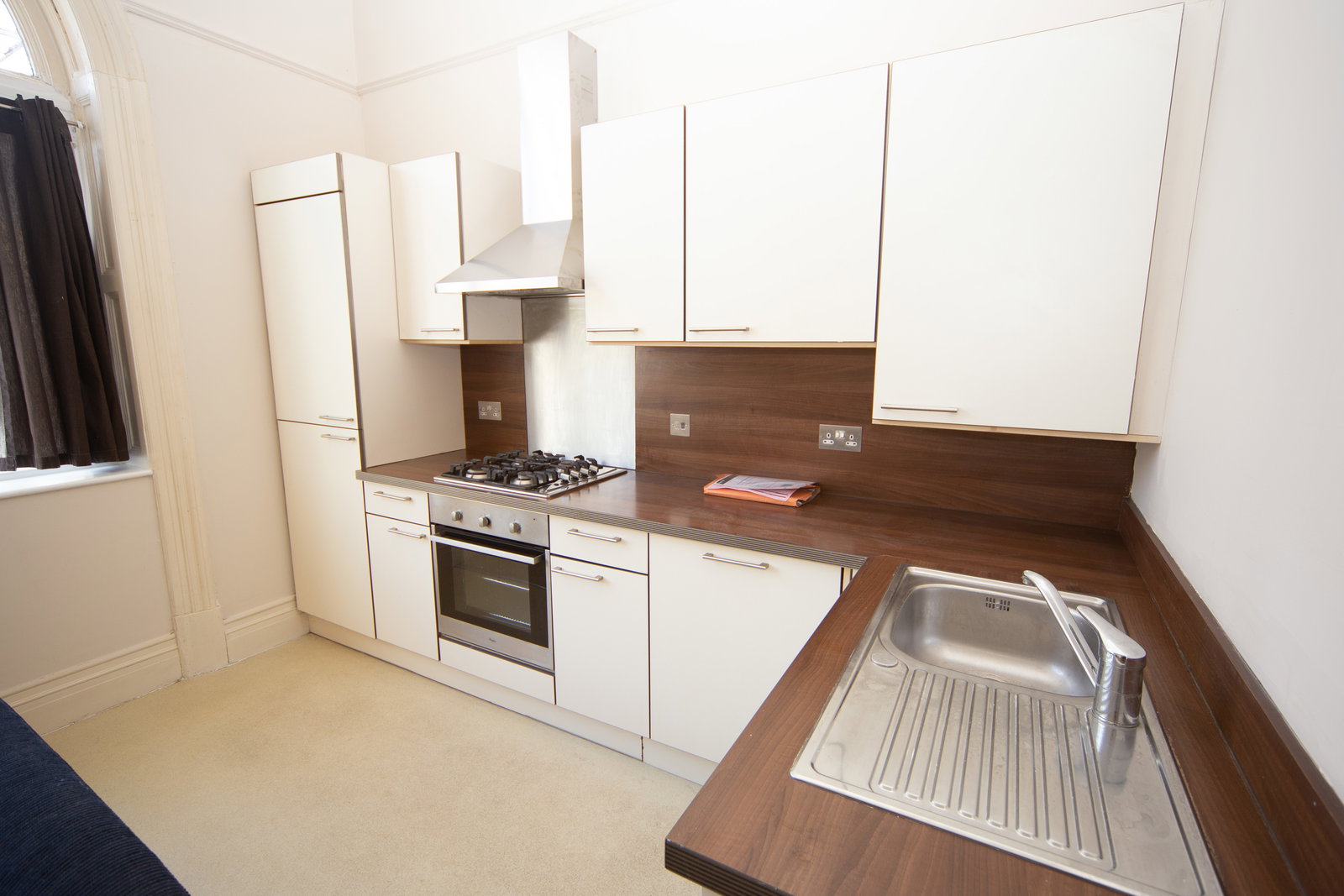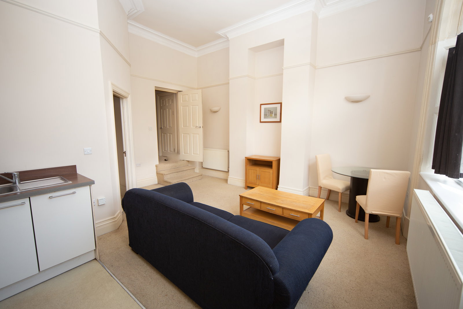 Steps lead to the entrance that you share with one other flat into the communal hall way and this apartment is to the left hand side. The property comprises of small hallway stepping down to the open plan living/kitchen area with high ceilings. The kitchen has built in appliances including a dishwasher. There is a modern bathroom with shower over the bath and a double bedroom. The property further benefits from gas central heating area and a basement area in the main building to store bikes.